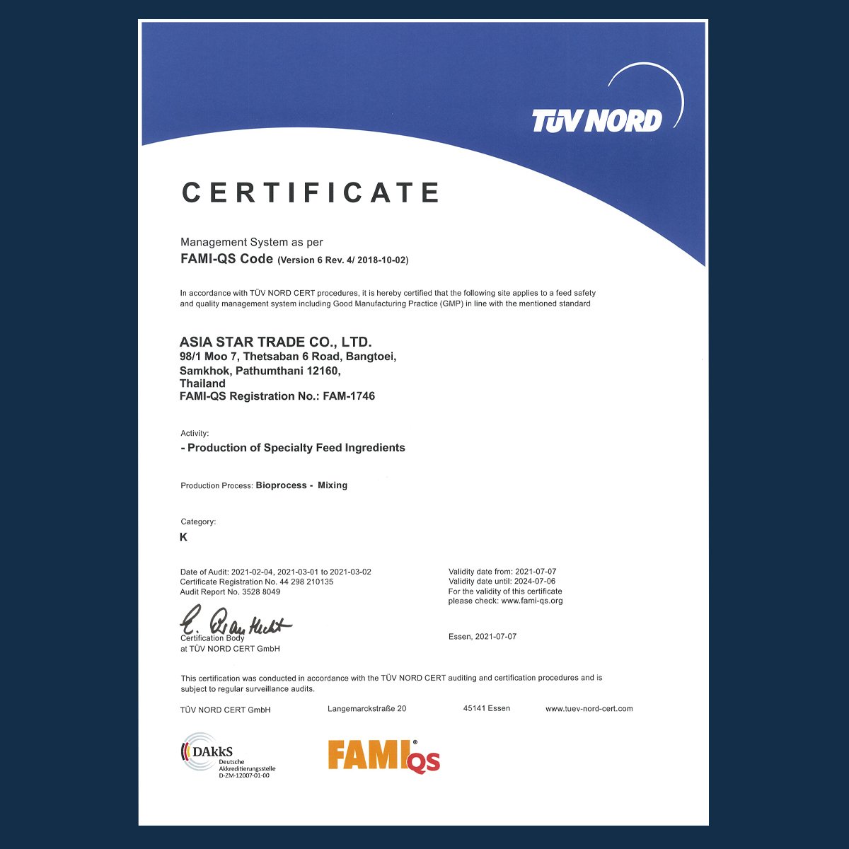 คุณพันพยนต์ จันทร์ดิษฐ์ ผู้จัดการฝ่ายผลิต บริษัทเอเชีย สตาร์ เทรด จำกัด และทีมงาน ทำการรับมอบเครื่องหมาย FAMI-QS ซึ่งเป็นเครื่องหมายการันตีมาตรฐานรับรองความปลอดภัยของอาหารสัตว์และคุณภาพของผลิตภัณฑ์ที่ผลิต โดยผ่านกระบวนการตามที่กำหนดไว้ในระเบียบอาหารสัตว์แห่งยุโรป