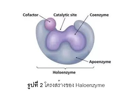 เอนไซม์เกือบทุกชนิดมีส่วนประกอบเป็นโปรตีนเพียงอย่างเดียวซึ่งประกอบด้วยกรดอะมิโน (amino acid) หลายชนิดมาต่อกันเป็นสายยาวด้วยพันธะเปปไทด์ (peptide bond) ดังแสดงในรูปที่ 1 แต่มีเอนไซม์บางชนิดที่มีส่วนที่ไม่ใช่โปรตีนเป็นส่วนประกอบด้วยจึงถูกเรียกว่า “Haloenzyme” อันประกอบด้วย 2 ส่วนคือส่วนที่เป็นโปรตีนซึ่งเรียกว่า “Apoenzyme” และส่วนที่ไม่ใช่โปรตีนซึ่งโดยรวม ๆ เรียกว่า “cofactor” (โคแฟกเตอร์) ดังแสดงในรูปที่ 2 หากโคแฟคเตอร์เป็นสารอนินทรีย์จำพวกอิออนของโลหะ(metal activator) เช่น Mg2+ Fe2+ Cu2+ Na+ K+ เป็นต้น จะเรียกว่า “Metalloenzyme” ก็ได้ หากโคแฟคเตอร์เป็นสารอินทรีย์ เช่น NADP FAD ATP วิตามิน เป็นต้น จะเรียกว่า “coenzyme” หากโคแฟกเตอร์เป็นโมเลกุลของสารอินทรีย์ที่ยึดเหนี่ยวกับส่วนที่เป็นโปรตีนด้วยพันธะโควาเลนท์ (covalent bond) จะเรียกว่า “prosthetic group” Haloenzyme นี้ต้องมีครบทั้ง 2 ส่วนดังกล่าวจึงจะสามารถเร่งปฏิกิริยาเคมีได้