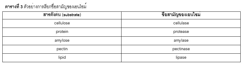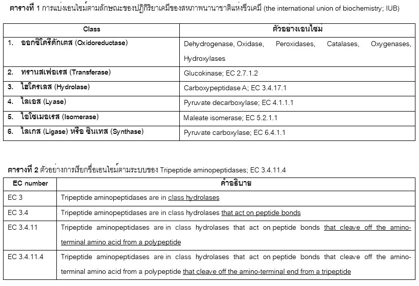 สหภาพนานาชาติแห่งชีวเคมี (the international union of biochemistry; IUB) จำแนกเอนไซม์ออกเป็น 6 กลุ่ม (class) ตามลักษณะการเกิดปฏิกิริยาเคมี ดังแสดงในตารางที่ 1 และสามารถเรียกชื่อเอนไซม์ด้วยเลขรหัส the enzyme commission number (EC number) EC X1.X2.X3.X4 อันประกอบด้วยเลข 4 ตัวและมีจุดคั่นระหว่างเลขแต่ละตัว ยกตัวอย่างเช่น tripeptide aminopeptidases; EC 3.4.11.4 อธิบายได้ตามตารางที่ 2 นอกจากนี้เอนไซม์ยังสามารถเรียกแบบชื่อสามัญได้โดยเติม –ase เข้าไปท้ายชื่อสารตั้งต้น (substrate) ที่จะทำปฏิกิริยากับเอนไซม์นั้น ๆ ดังแสดงในตารางที่ 3